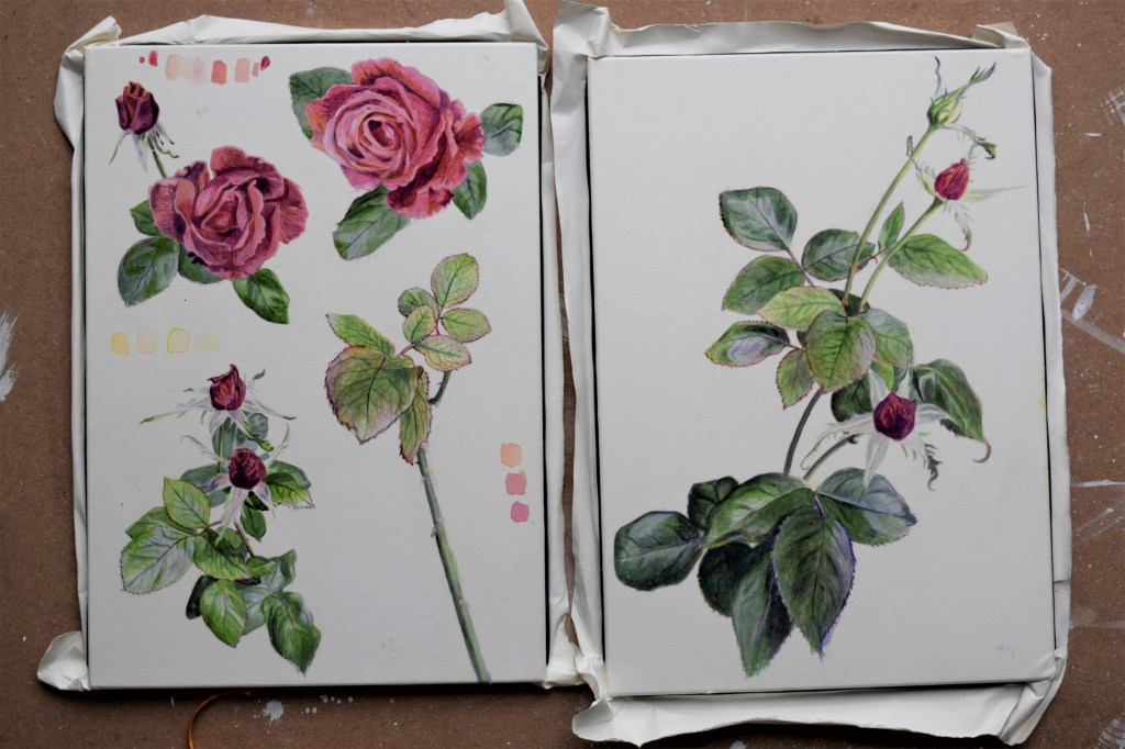 All the individual rose plants will feature in this 50 Flowers Project, (so I will save sharing them with you in detail until later posts!) However, I did spend many hours painting the roses in the summer of 2020 for a commissioned artwork – you can see it here.