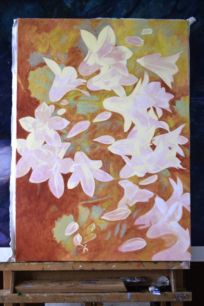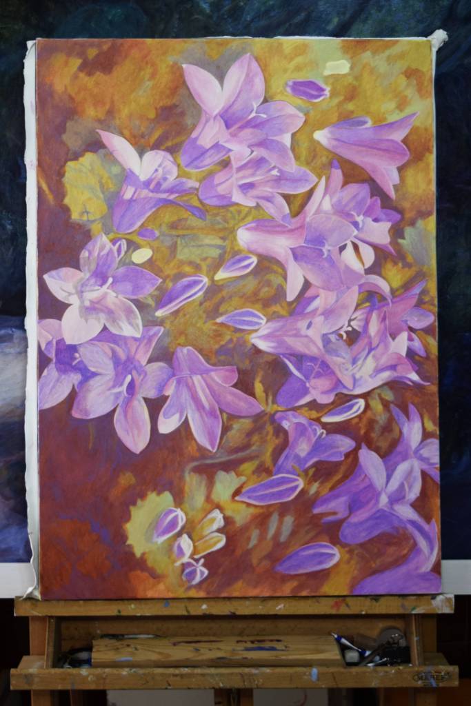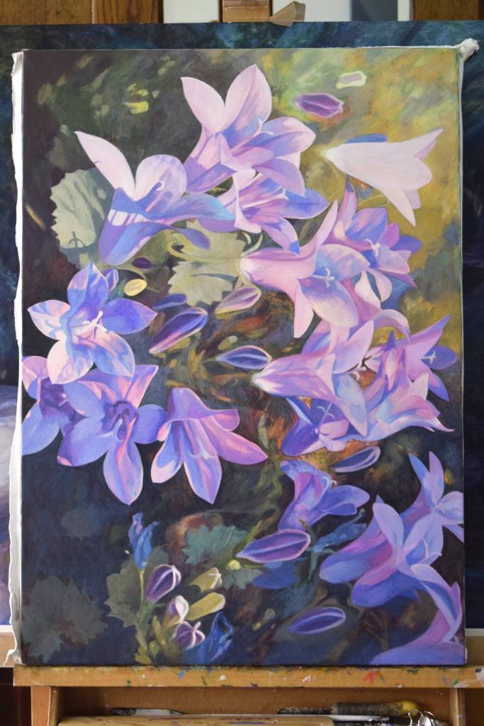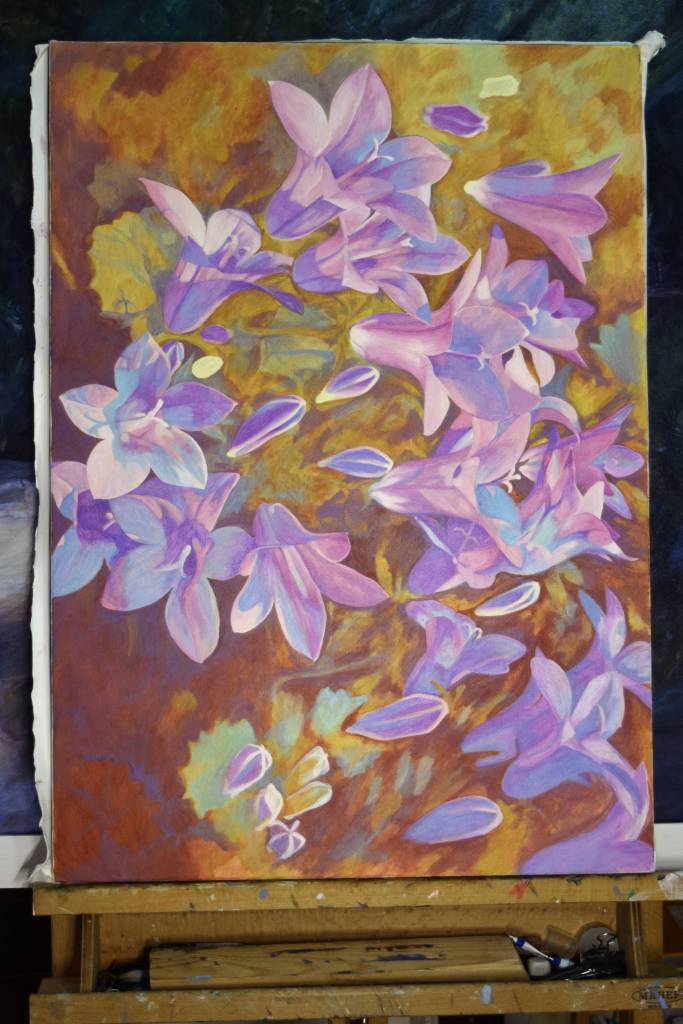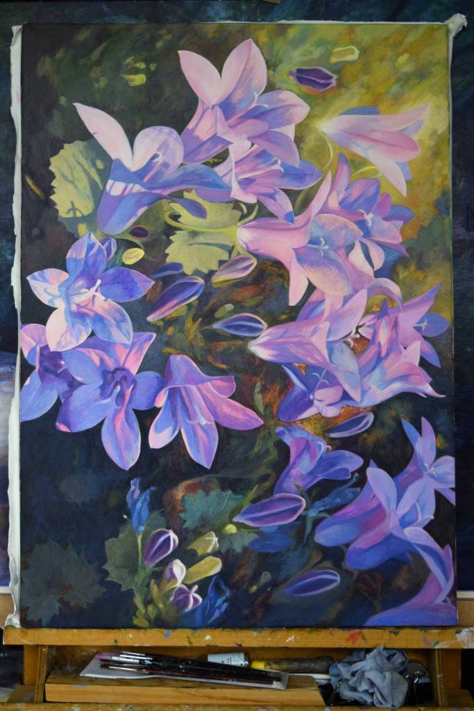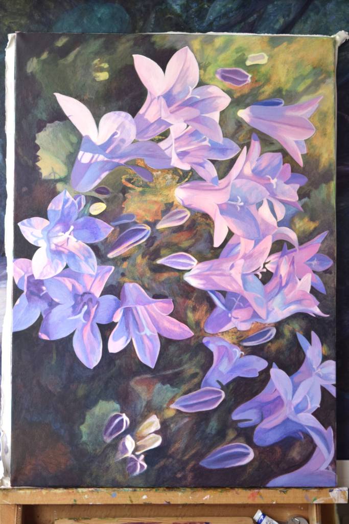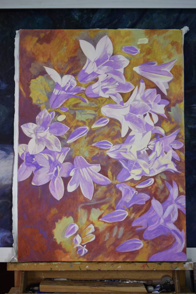 My students often get to see my paintings in progress and they are interested in how I create my painting and the techniques I have used. So for those of you who are interested, these are photographs I took from the start to the end of painting ‘Bellflowers’.