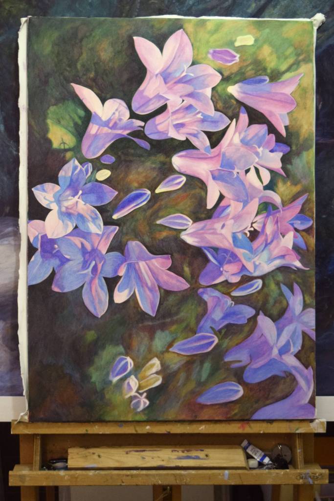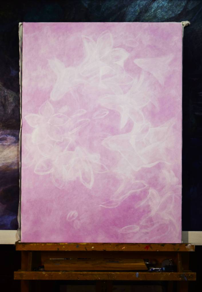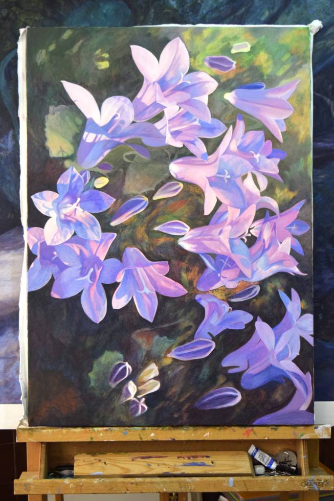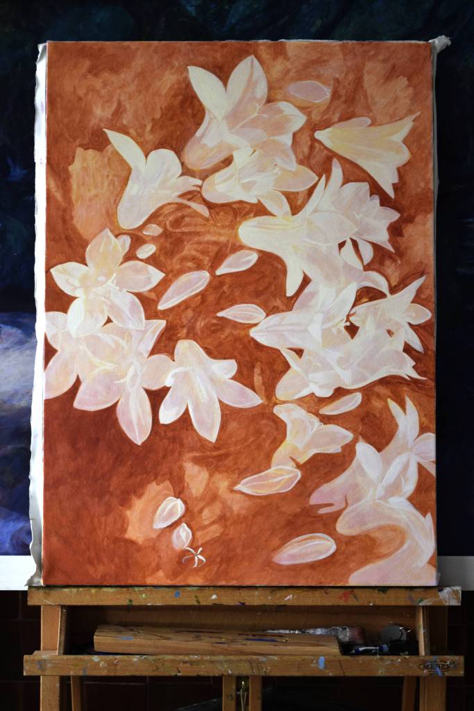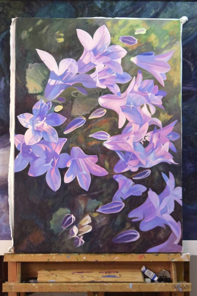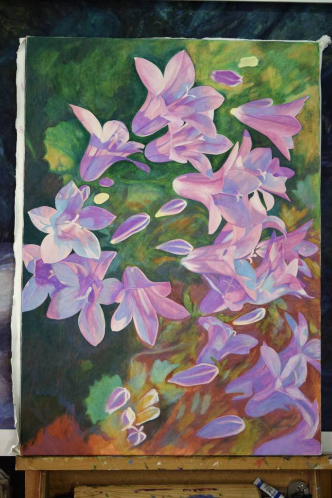 My students often get to see my paintings in progress and they are interested in how I create my painting and the techniques I have used. So for those of you who are interested, these are photographs I took from the start to the end of painting ‘Bellflowers’.