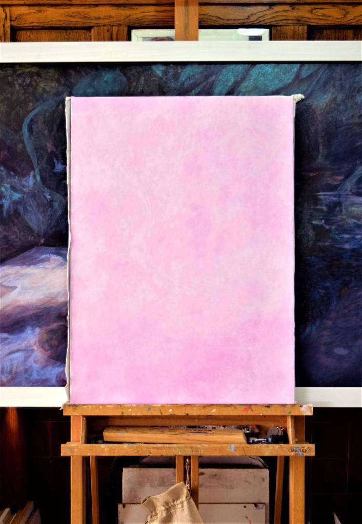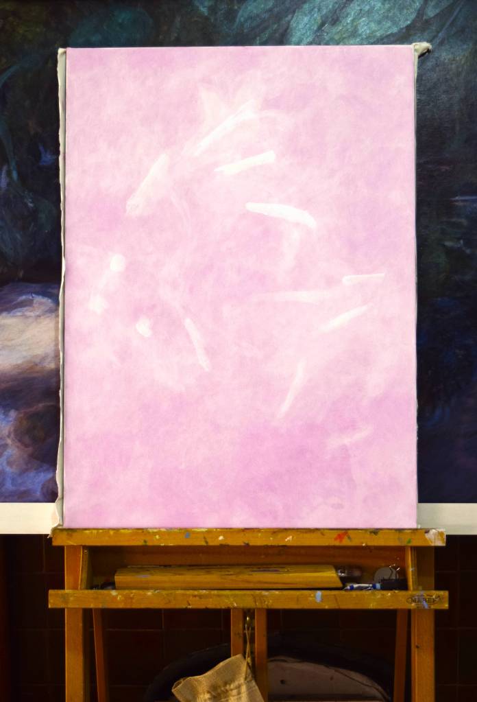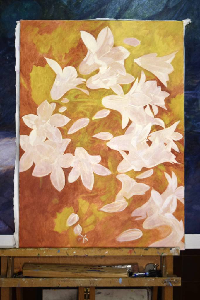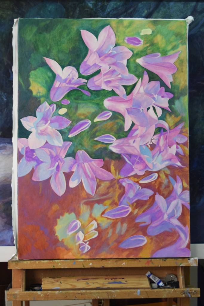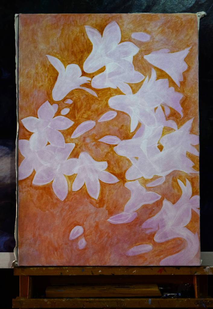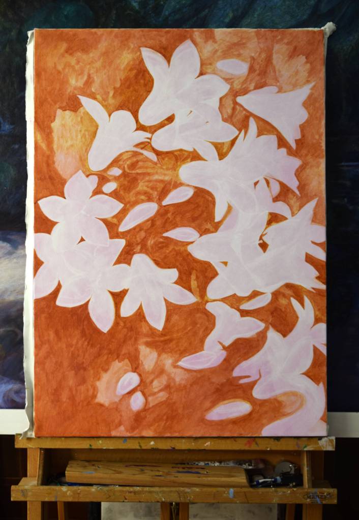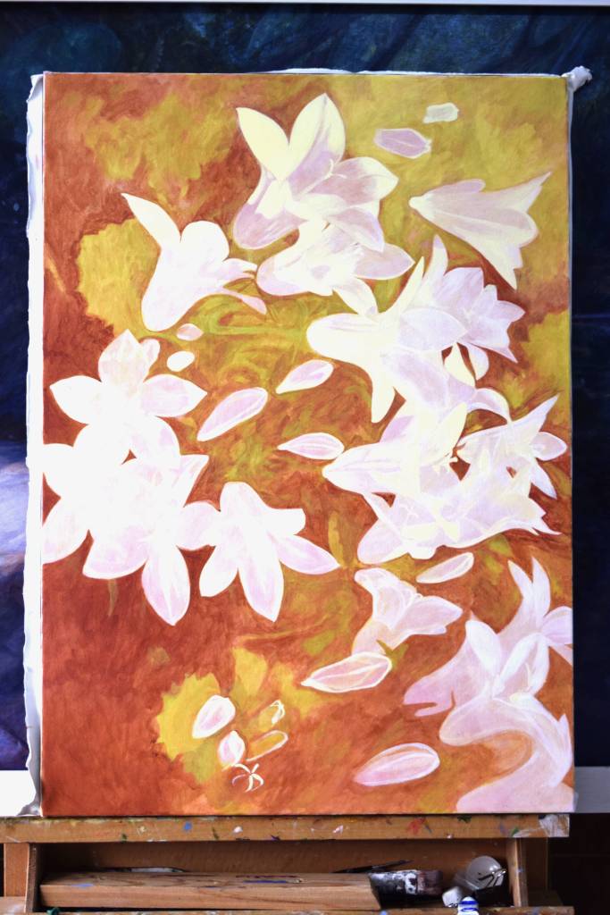 My students often get to see my paintings in progress and they are interested in how I create my painting and the techniques I have used. So for those of you who are interested, these are photographs I took from the start to the end of painting ‘Bellflowers’.