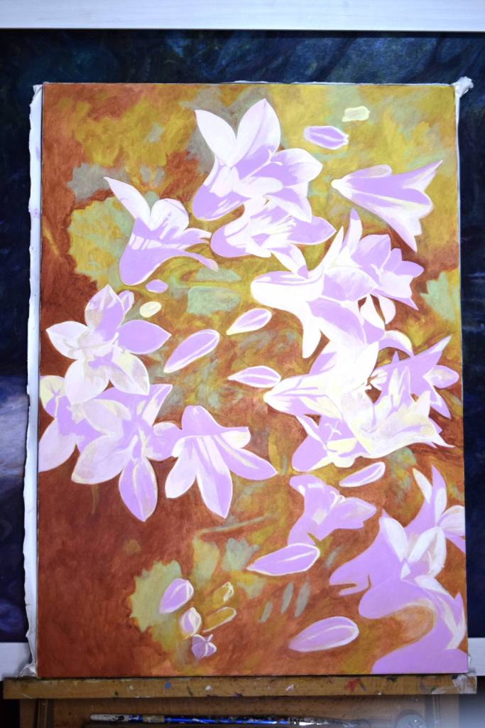 I usually start by painting a coloured background; often this is a colour I feel will be dominant in the final image. For Bellflowers I then started to sketch the main flower shapes using washes of white paint.