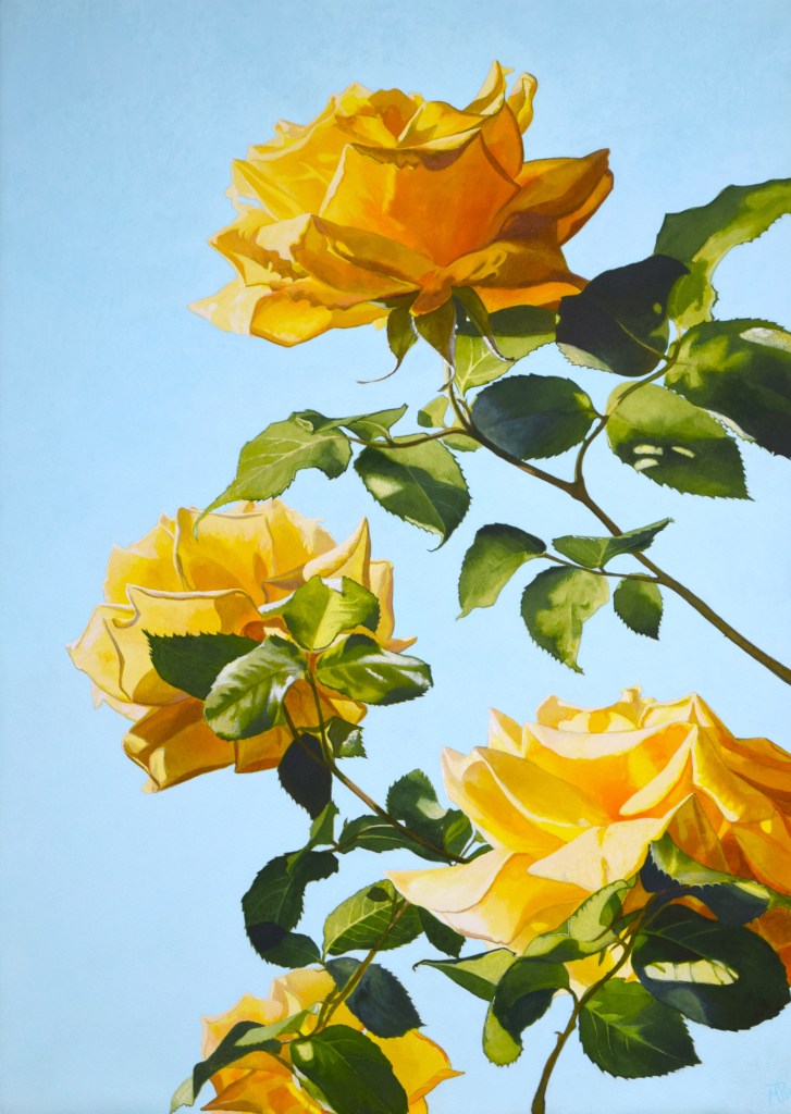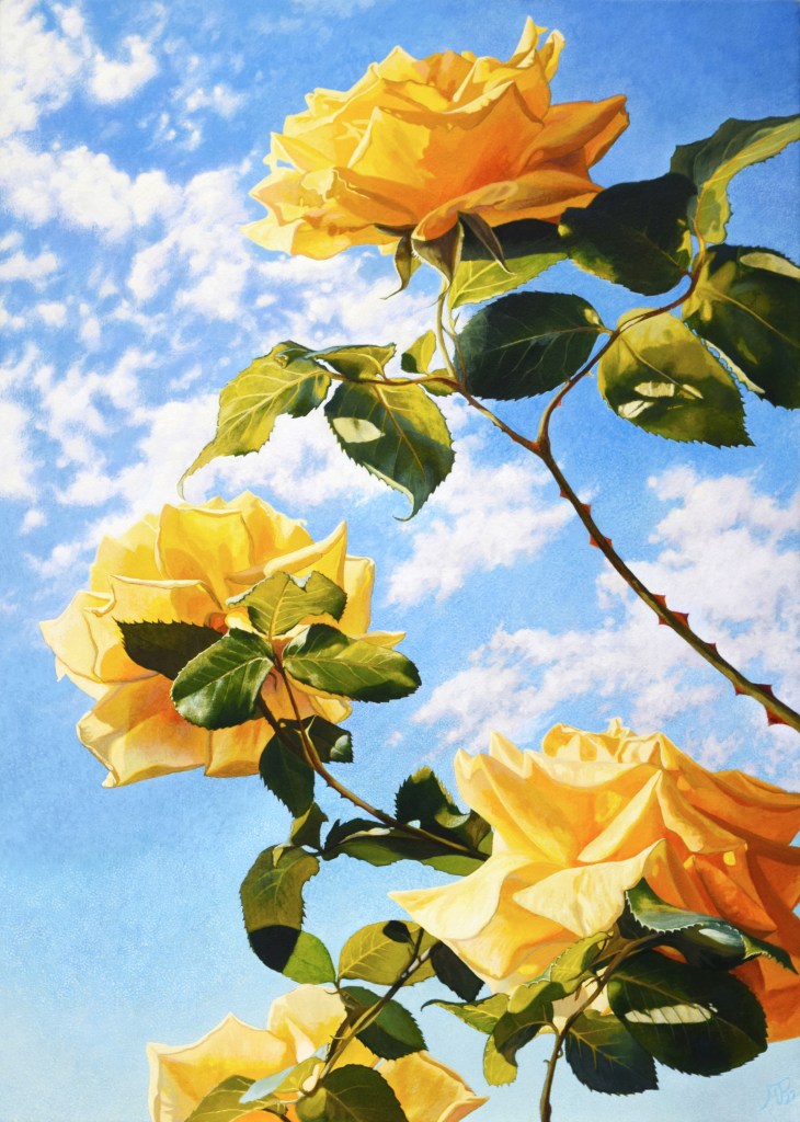 This is Yellow Rose #2. For this painting I chose to leave the background a flat pale turquoise blue colour, in order to ‘showcase’ the details and contrasts of the roses.