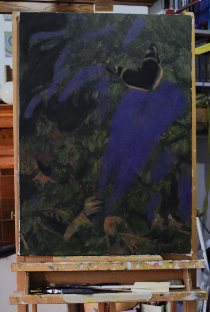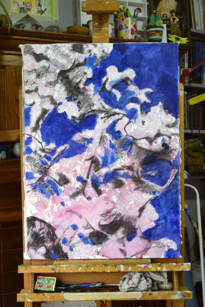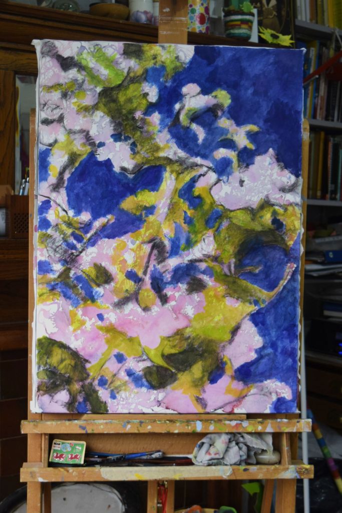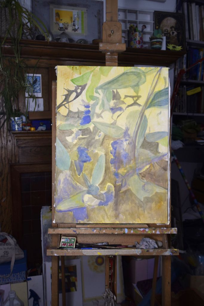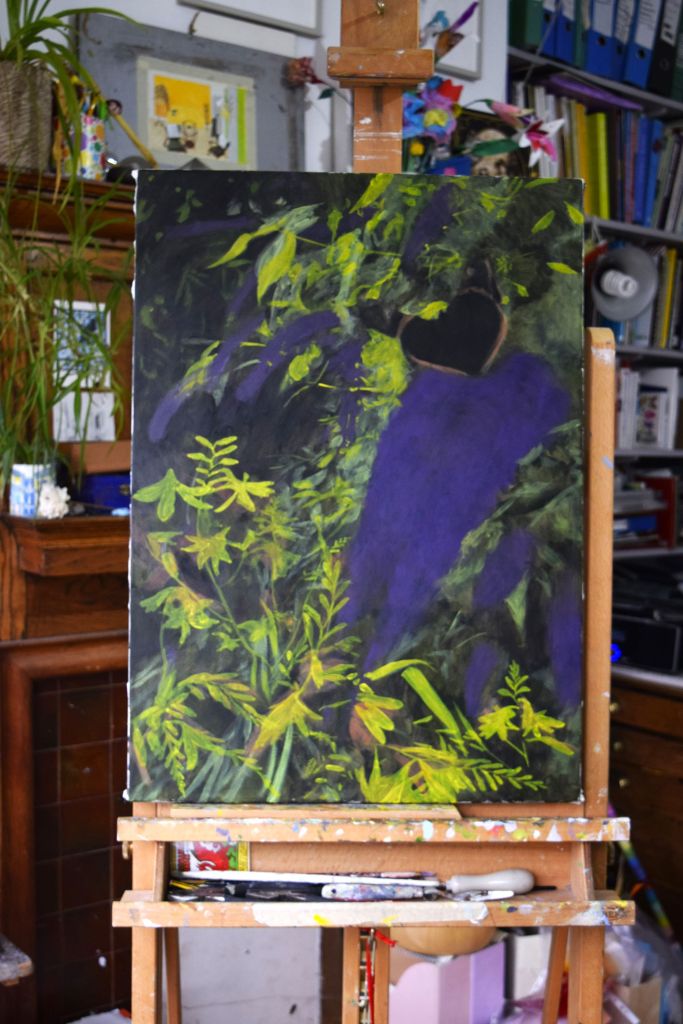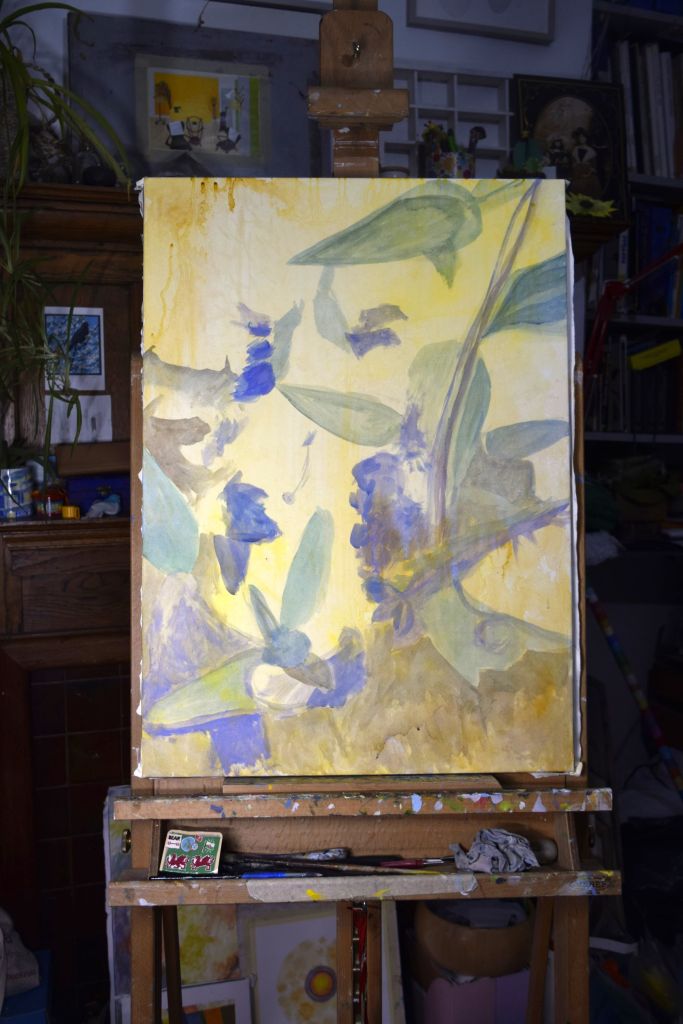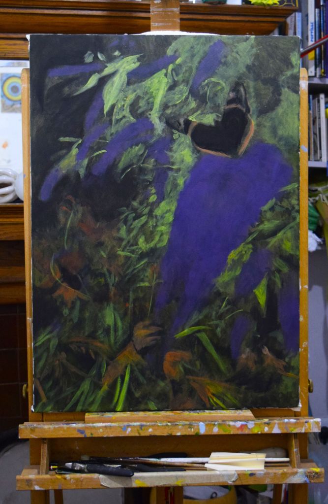 I am only at the first ‘drawing’ stages of this painting. Caryopteris, commonly known as Bluebeard, grows against the east-facing wall at the edge of our front garden. The Bluebeard spills over onto the street pavement and the early morning sun casts its light on the beautiful purply-blues of the small, delicate flowers.