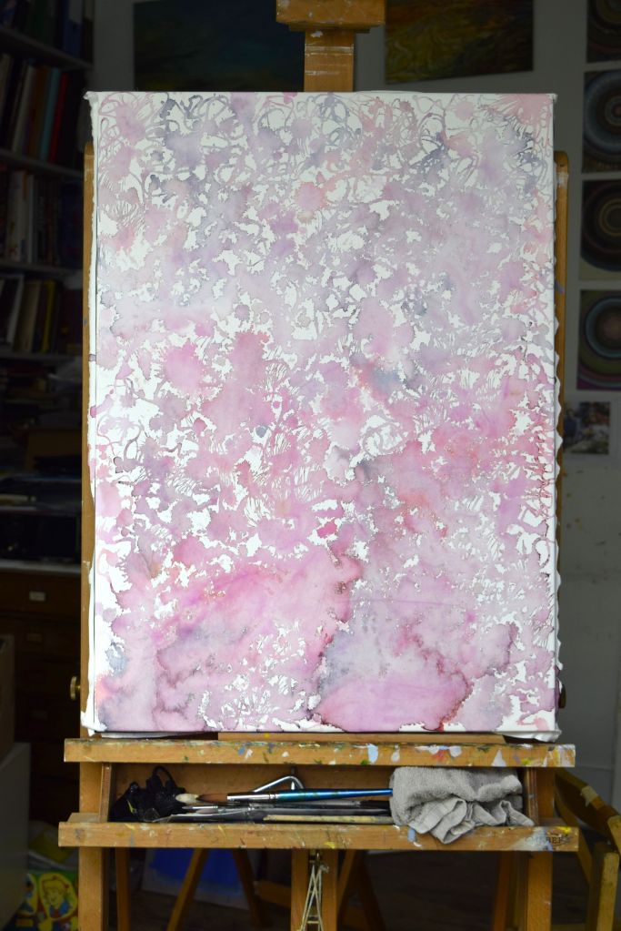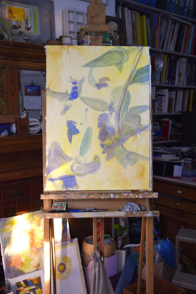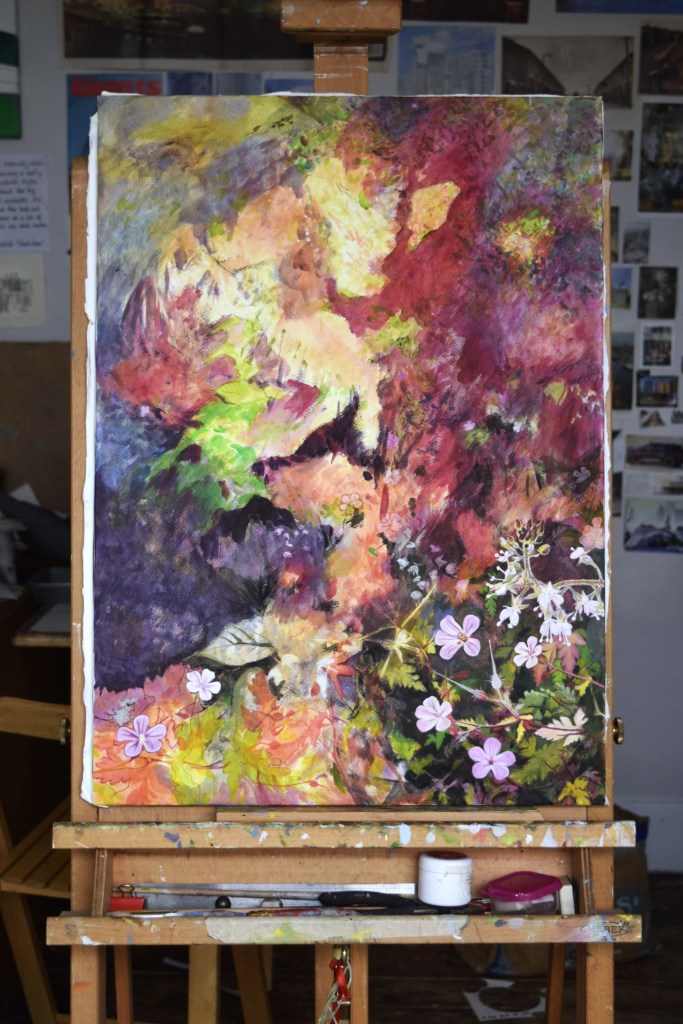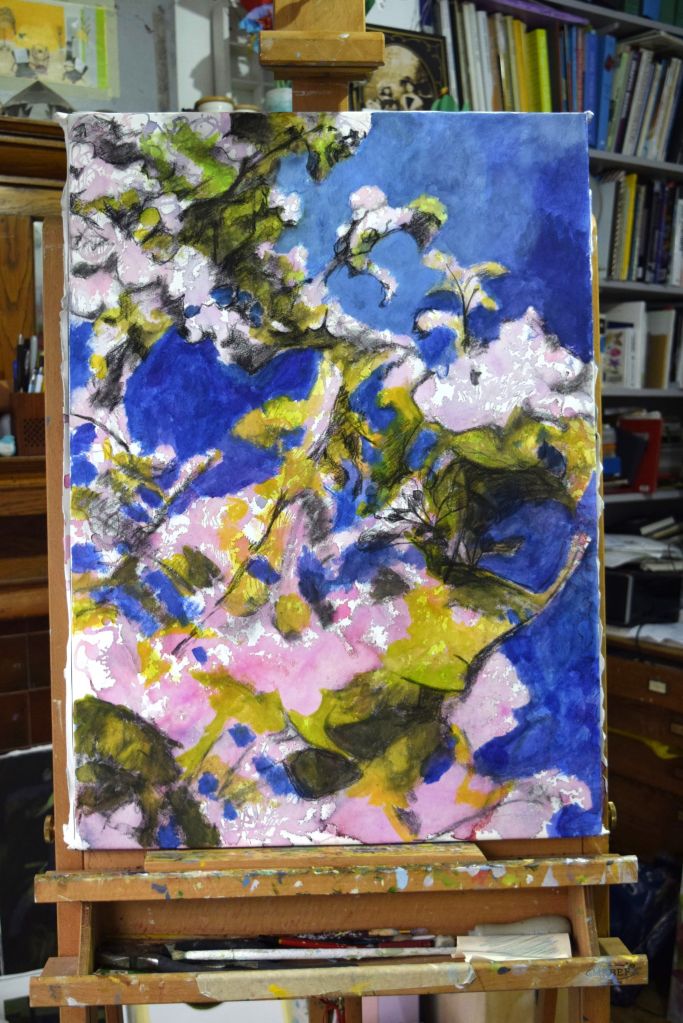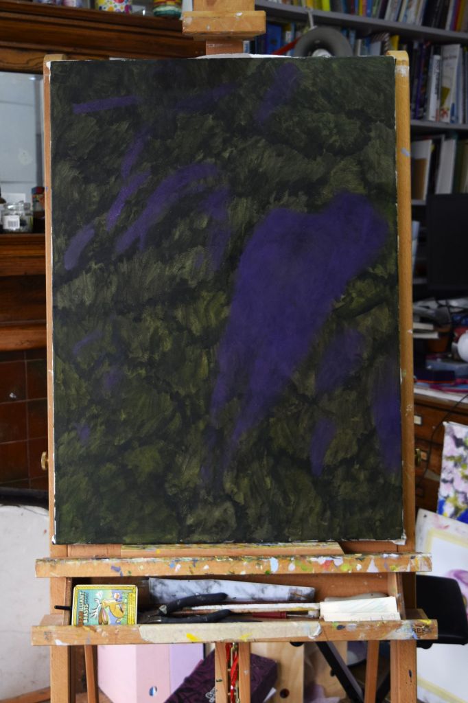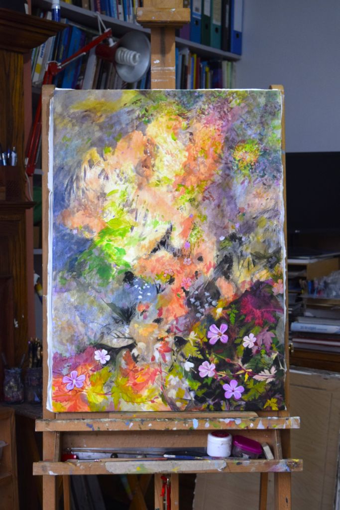 I am only at the first ‘drawing’ stages of this painting. Caryopteris, commonly known as Bluebeard, grows against the east-facing wall at the edge of our front garden. The Bluebeard spills over onto the street pavement and the early morning sun casts its light on the beautiful purply-blues of the small, delicate flowers.