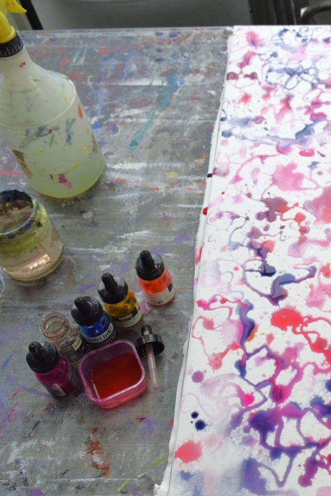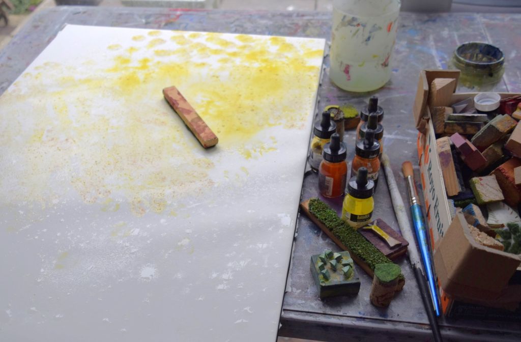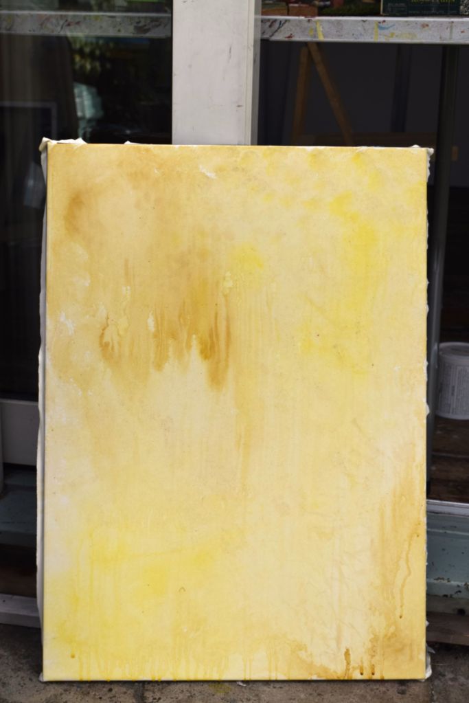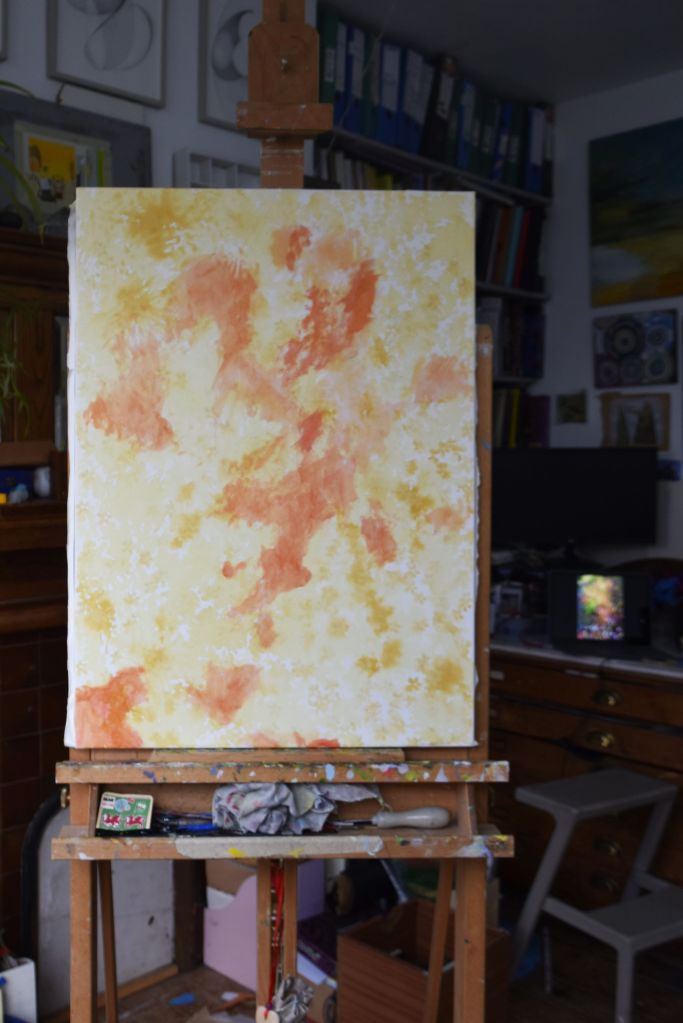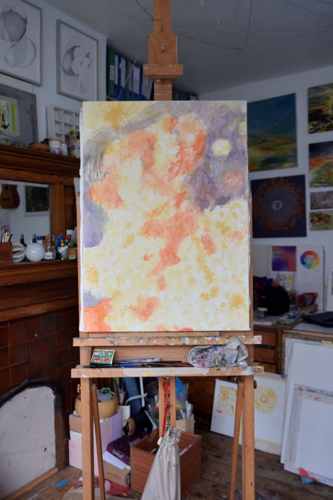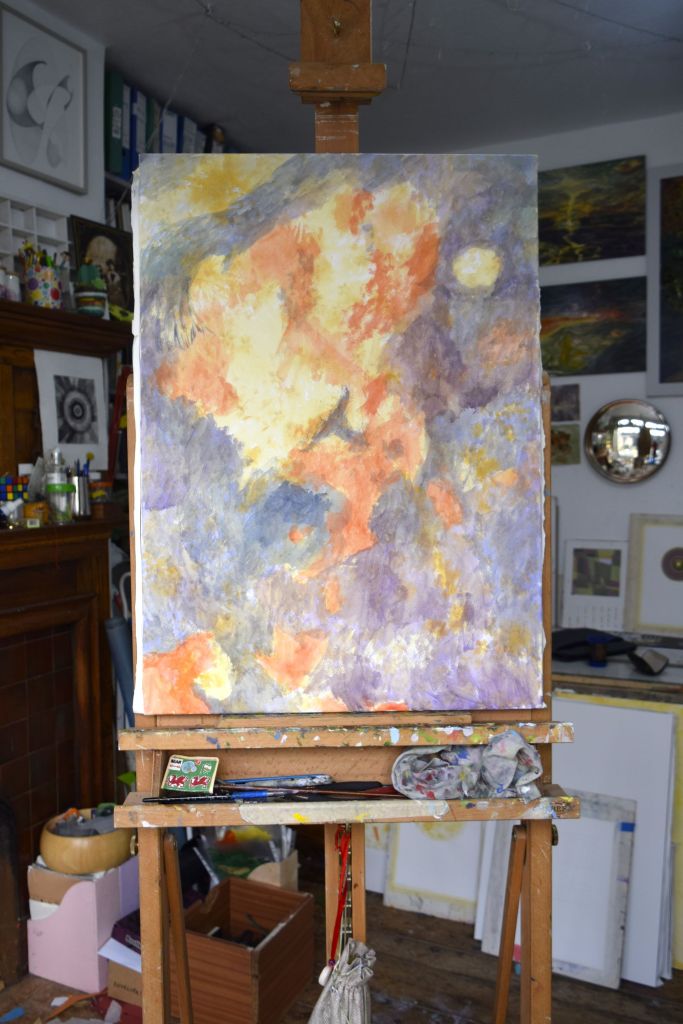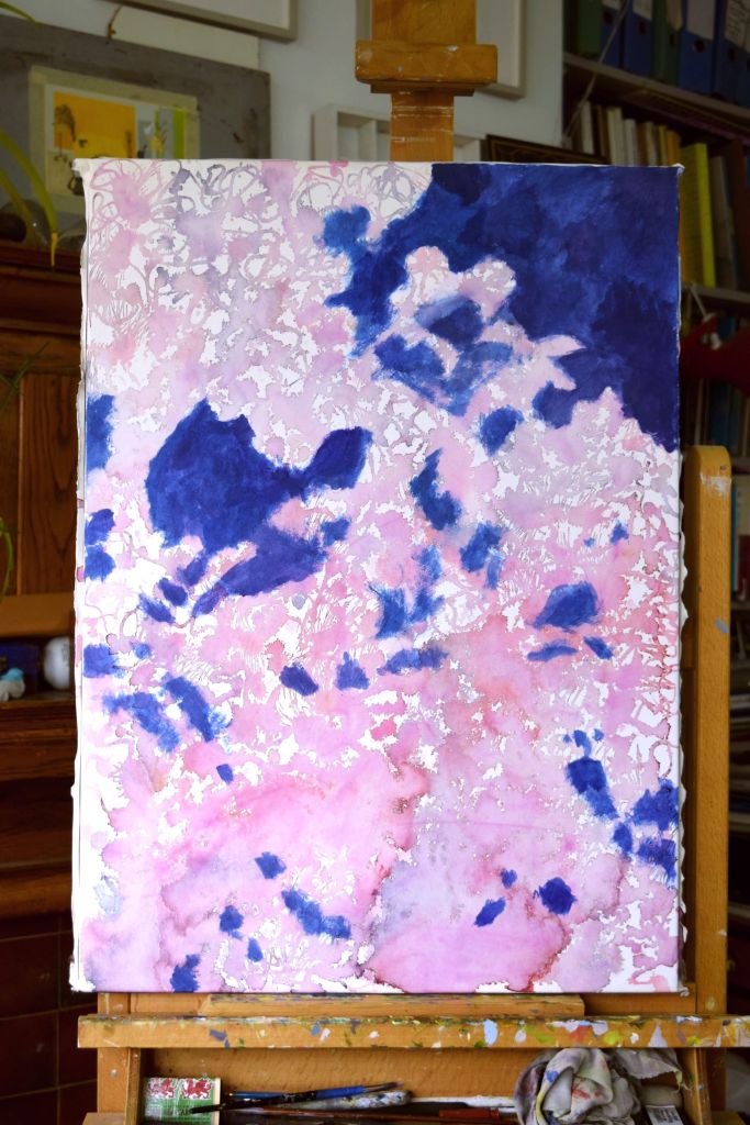 I am only at the first ‘drawing’ stages of this painting. Caryopteris, commonly known as Bluebeard, grows against the east-facing wall at the edge of our front garden. The Bluebeard spills over onto the street pavement and the early morning sun casts its light on the beautiful purply-blues of the small, delicate flowers.