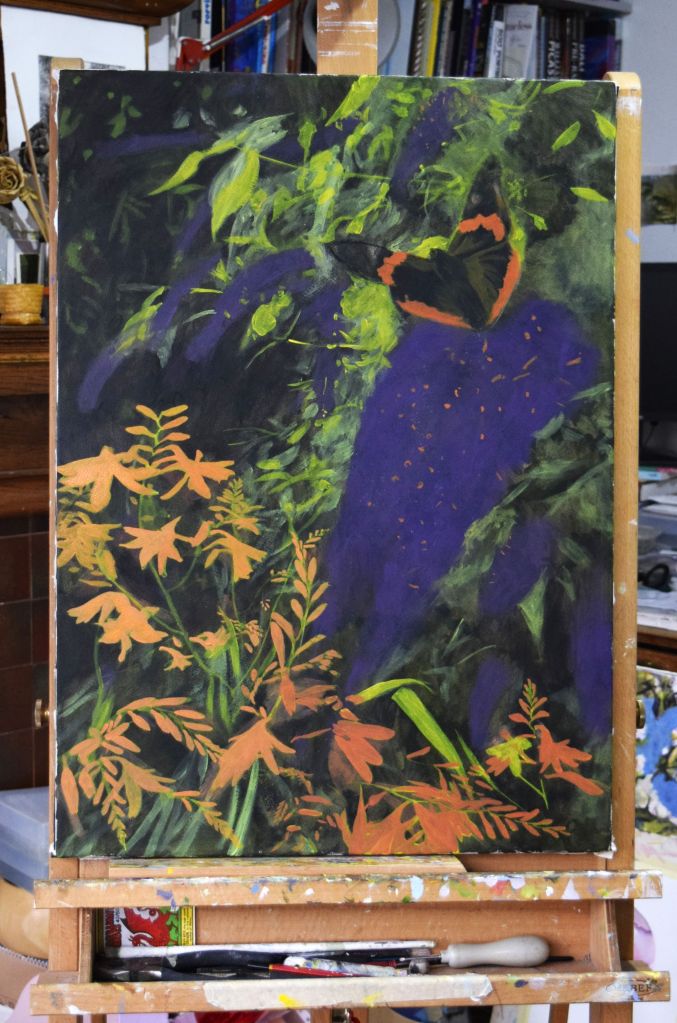 These two flowers grow next to each other in our back garden against a south-facing fence. Buddleia is often called know as the butterfly bush and ours definitely attracts lots butterflies, especially Red Admirals – with one featuring in my painting. Crocosmia is native to the grasslands of southern and eastern Africa and is listed on Schedule 9 of the UK Wildlife & Countryside Act as an invasive non-native species; therefore, gardeners should take efforts to control them. Happily I can report that my clump of Crocosmia (also known as Montbretia) is containing itself to its small patch and providing fantastic colour and shape contrasts to the Buddleia growing alongside.